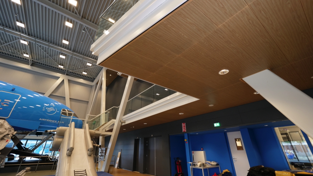 Blikvanger van 203X is de nieuwe praktijktrainingshal aan de rechtervleugel. Twee vliegtuigsimulatoren sieren de ruimte. De KLM-rompen op ware grootte zijn afkomstig van echte vliegtuigen. Volgens Griffioen is in deze trainingshal een goede akoestiek van groot belang. “In deze ruimte worden serieuze praktijkcases nagebootst. Daar is afleiding in de vorm van omgevingsgeluid niet wenselijk. In samenspraak met Armstrong Ceiling Solutions hebben we hier gekozen voor een geperforeerde staalplaten wand. Dit zorgt voor een perfecte akoestiek in deze grote ruimte. Ook in esthetisch opzicht is er meegedacht. Het verkeersgedeelte van de trainingshal vormt een aparte zone door toepassing van afwijkende materialen. Bij de plafonds wilde ik één geheel met het houten trappenhuis. De plafonds met houtlook maken het geheel helemaal af. Dankzij het goede meedenken van Armstrong staat er nu een trainingscentrum waar iedereen trots op is.”